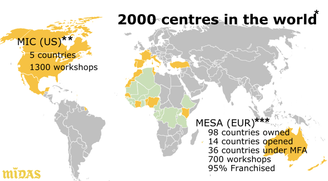 MESA (EUR) 98 países de propriedade, 14 países abertos, 36 países sob MFA (Acordo de Franquia Master), 700 workshops, 95% Franqueados ***